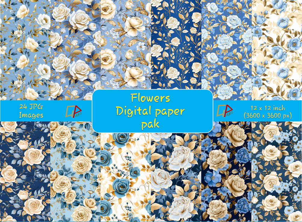 Floral Patterns,Blue sky and Gold Rose Digital Papers,Digital Papers,Seamless Repeat Pattern,Floral Background,Repeating Pattern,Floral Geometric,Digital Paper Digital Seamless Art,pack of 24 mpg images