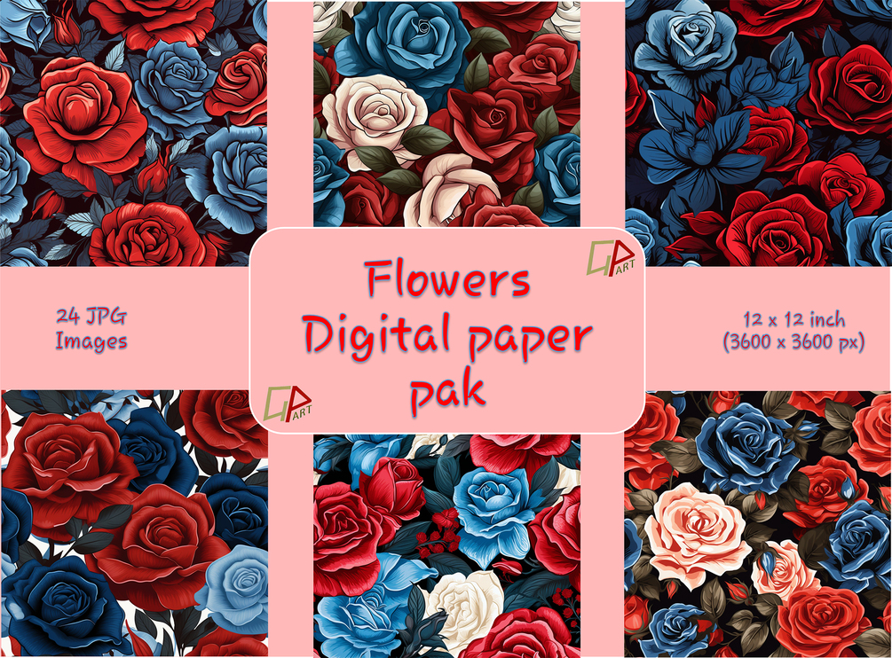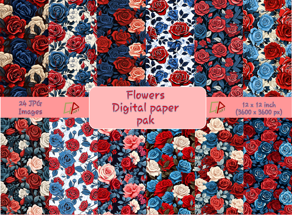 Blue and red Rose Floral Pattern Design, Digital Papers for Scrapbooking and Crafts,Repeating Pattern,Floral Geometric,Digital Paper Digital Seamless Art,pack of 24 mpg images