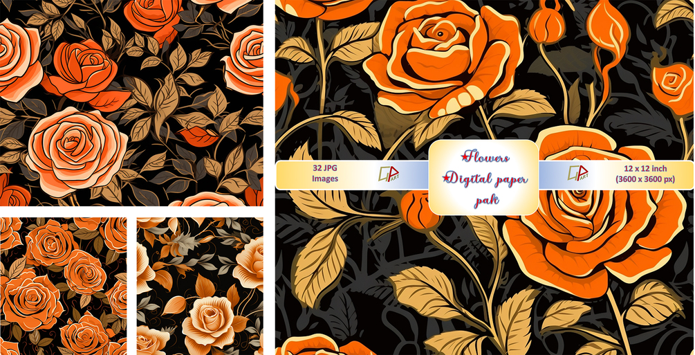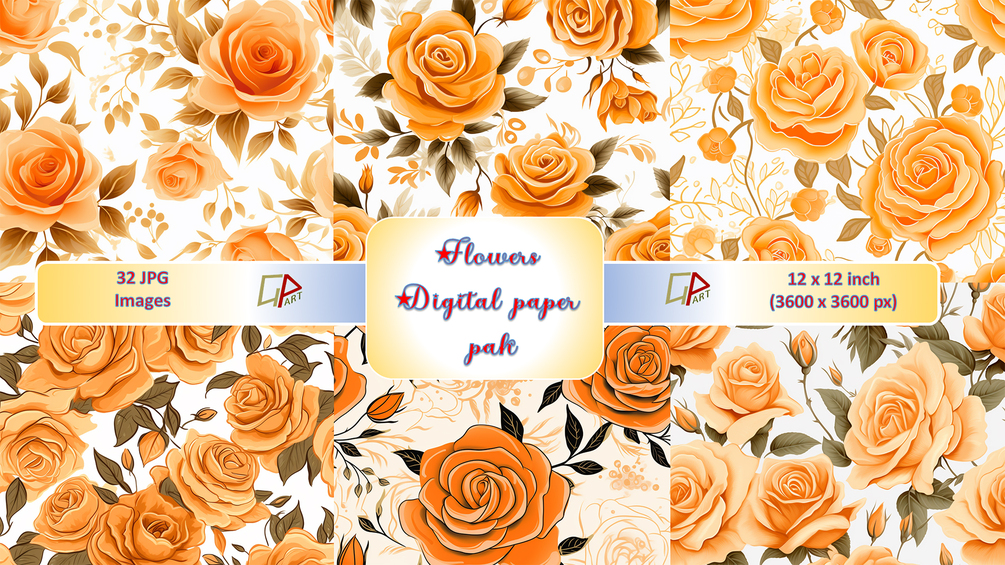 Discover the perfect blend of elegance and creativity with our exquisite digital papers - the orange and Gold Rose Floral Pattern Design! Elevate your crafting projects, stationery designs, and DIY endeavors with these high-quality printable backgrounds. Instantly download and immerse yourself in the beauty of artistic and decorative elements that are ideal for scrapbooking, card making, and more. Enhance your projects with unique and affordable digital papers, attracting customers from America, Canada, the United Kingdom, and all across Europe. Don't miss out on this opportunity to add an enchanting touch to your creations!